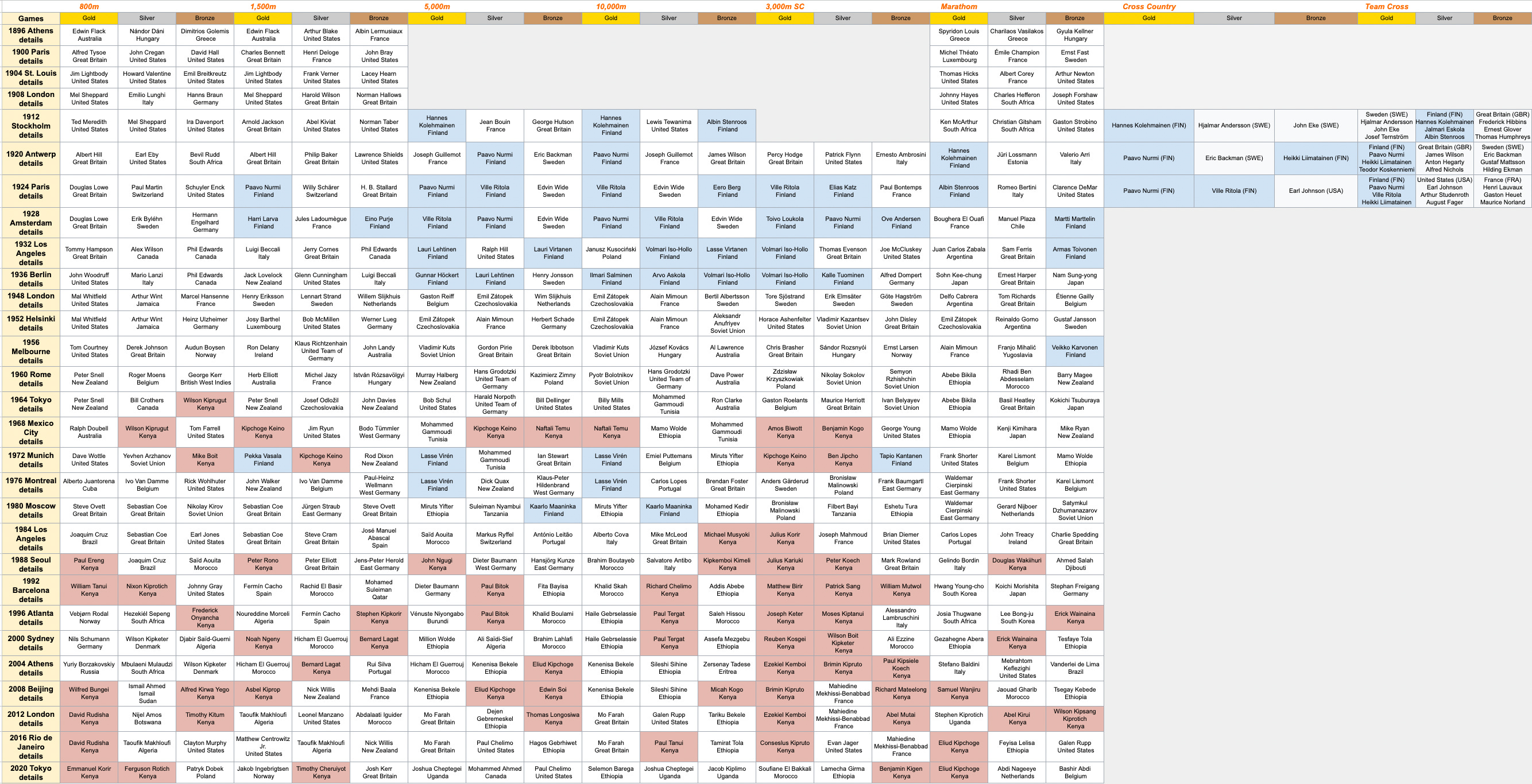 As covered earlier, Finland are the 3rd most successful, still active, T&F nation in Olympic history. Kenya will overtake them and move into 3rd place for total medals during the Paris Olympics next summer, i’ll guess that they’ll do it with a final weekend medal in the women’s marathon. Kenya will overturn Finland’s 14 gold medal lead too - a date on that less certain, but it’ll probably happen in the 2030s. Like the Finns, Kenya’s T&F success is built on events from 800m through to the marathon and if you really want to stretch the link between the two nations, Kenya’s sole field medal was achieved by Julius Yego in the Javelin.