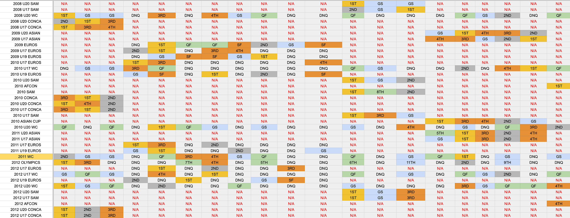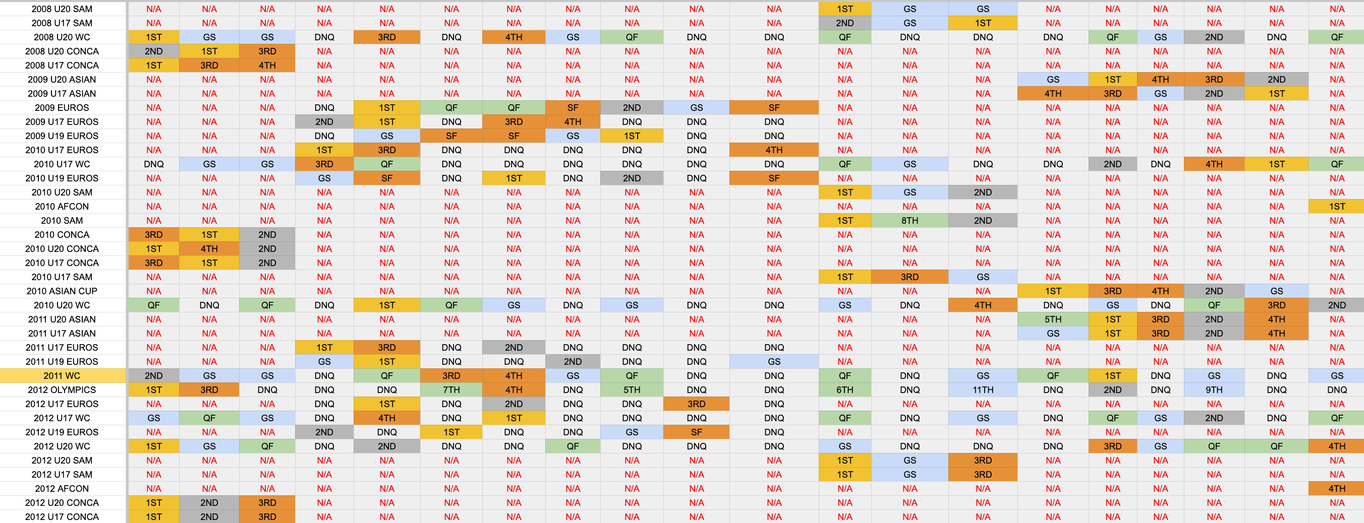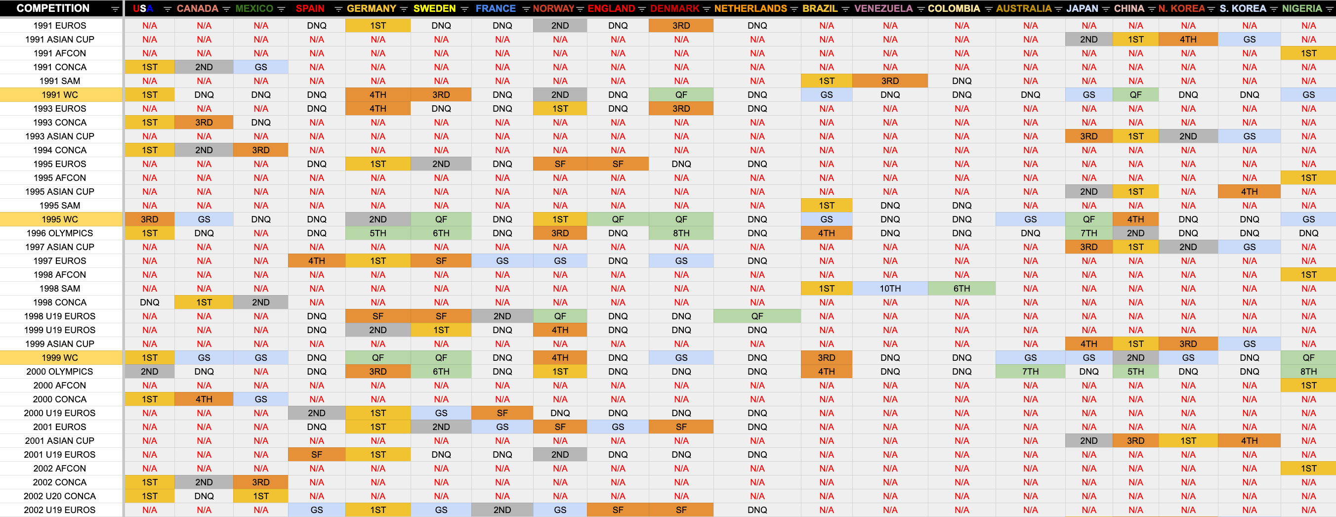 Does the next Sam Kerr spend 7 years of her career in the US National Women’s Super League? Probably not. That’s a growing problem for US Soccer as the Spanish, French and English leagues grow in financial power and get first dibs on the best talent across the globe, increasingly the overall standard of their leagues that their domestic players have to break through in to - the positive read is iron sharpening iron. Another issue, is the question of if players play too much for the USWNT and not enough club football? Mallory Swanson has already been mentioned, since her debut in 2017 she’s played 89 games in the NWSL - and 88 games for the USWNT. This is common in sports like cricket, the league is built to serve the National team and funding for the league reflects that, but forms a vicious cycle where the National team need to play a lot to keep the sport afloat as the main breadwinners and the league diminishes as their best players aren’t expected to prioritise club football. To contrast Swanson, England’s Georgia Stanway since the beginning of the 2017/18 season, has played 177 club games* and 56 games for England (+ 14 age group games). An over-reliance on friendly games for player minutes is not ideal for player development. but a lot of these games also come in ‘competitive’ CONCACAF competitions. Ultimately, the talent gap is too big for these games to be as useful as they should be - the US have a +206 goal difference (212 scored v 6 conceded) in their 31 year, 44 game CONCACAF Women’s Championship history. This over-reliance on national team game time also causes problems in selection, how do you judge if you have the best 23 players, if the only other sample you see them in is small and often without some of the senior USWNT or elite foreign talent to compare against.