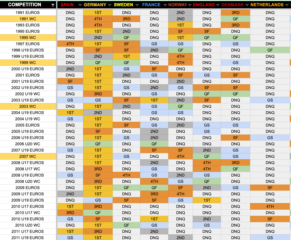 Spain were something of an irrelevance on the global or continental stage, for the first 18 years of the sport. Germany were established as the dominant European side, in 30 G+C (Global+Continental) tournaments, they progressed to the semi-final stage 27 times overall, going on to winning 16 tournaments outright. In an apparent aberration, Spain made their way through to the 2009 U17 Euros final, giving themselves the chance to cause an upset v Germany. They lost 7-0. However, the next year, Spain returned and won the tournament, courtesy of a squad featuring future two time Ballon d'Or Féminin winner Alexia Putellas playing up an age group. This qualified them for the 2010 U17 World Cup, Spain’s first Women’s World Cup at any age level, where they finished 3rd. In 2011, many of this group were eligible to play and win the U17 Euros again and then in 2012, having finally made the step up to U19s, this 93+94 born cohort missed out on completing the youth Euros double in a final defeat against a Sweden side featuring many now familiar names (Elin Rubensson, Magdalena Eriksson, Fridolina Rolfo, Lina Hurtig, Joanna Andersson, Amanda Ilestedt). This was established as a talented cohort in isolation, but was it anything more?