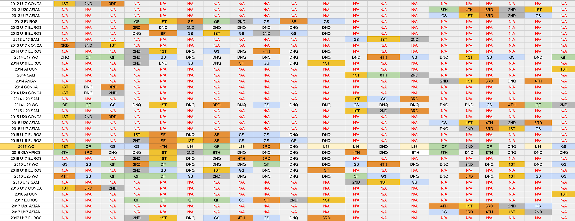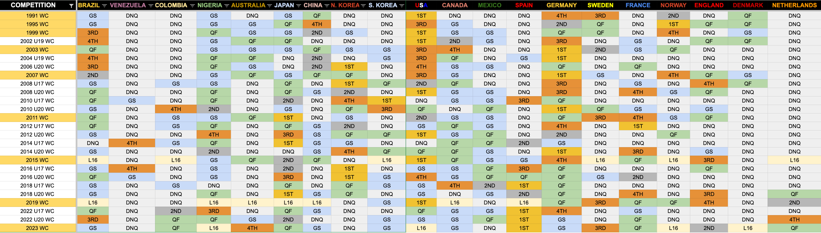 That last sentence may seem hyperbolic and understandably, many reflexively assume the USA still maintains an overall talent advantage. Other than participation numbers, there is scant evidence to back up that claim, the only real argument is that because it’s been the case for 32 years, it will continue to be the case. The USA will not slide into irrelevance, they’ll turn up to every World Cup with a chance of winning, but they’re not the presumptive favourites and it’s not because of anything they’ve changed, but the competition improving. They had a huge first mover advantage, but then others started moving - exposing that their talent development system was not as robust or efficient as their senior success suggested.