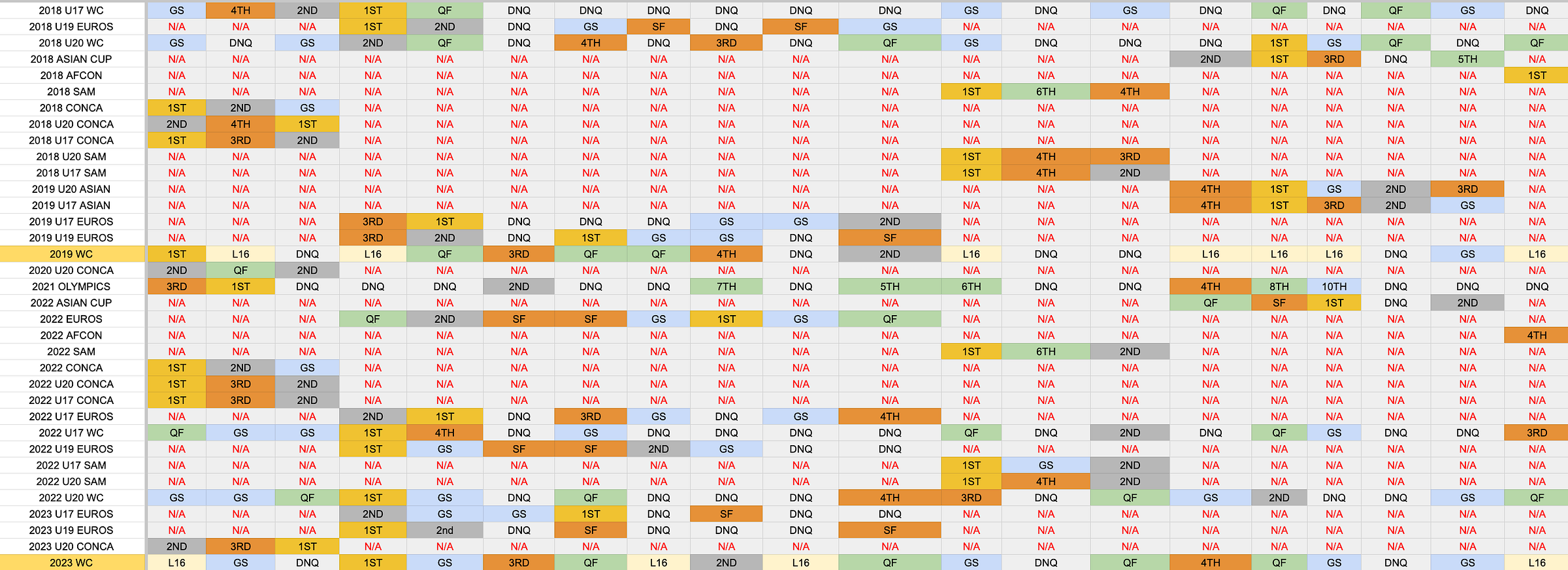 We’ve established that Japan are Spain’s perennial rivals, facing each other 8 times in the last 7 age group World Cups, and likely to face off countless times again in the next decade. Which is the 3rd country, after Japan and Spain, to win both the U17 and U20 World Cup? Japan’s continental rival, North Korea. Of all the variables impacting the women’s football landscape that i’ve tried to touch on, they’re the most complicated. Over the last 15 years, they may lay claim to being the most successful youth system in women’s football, with 4 U17 World Cup finals (3 wins) and 2 U20 World Cup finals (1 win). In 2011, their senior team had a raft of positive doping tests at the World Cup, were banned from subsequent competitions and only returns, for a failed run at Asian Cup qualifying in 2017. During this time, their youth teams continued to compete, despite graduates having nowhere to graduate to, finishing 2nd at worst in all continental tournaments all the way up until 2019. In November 2019, North Korea men’s senior team played a World Cup qualifier against Lebanon, this was the last time a side representing their nation took to the field at any level of football on either the men’s or women’s side. Having withdrawn from every fixture or tournament since, a return in the 2023 Asian Games is expected, to end their 4 year absence. On the women’s side, if they do not return, then their wins, finals and World Cup qualifications, will have to trickle down to other nations, the likely recipients being China, South Korea and Australia. You can not win, if you do not play, and currently North Korea are not playing.