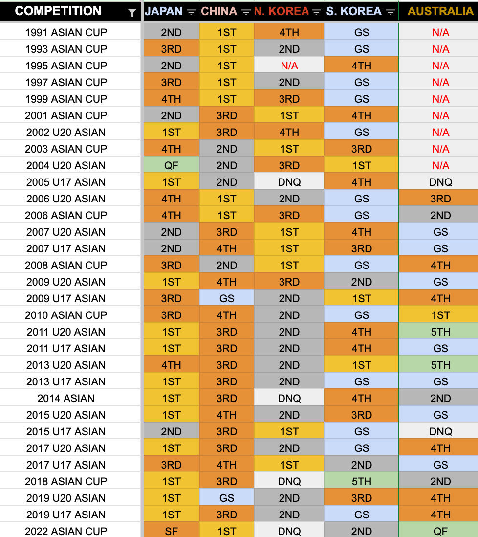 *Asian women’s football shines a light on how random factors can alter the development of a nation’s football system. Who is the 6th best Asian football nation?It’s a trick question really because Australia isn’t in Asia, yet they occupy one of the top 5 spots and may be established as the 2nd best side. This all hinges on their 2006 decision, to leave the Oceania Football Confederation (OFC) and join the Asian Football Confederation (AFC), a decision made to play against more competitive (and richer) opponents for their own personal development. Not only did this make it much harder for Chinese Taipei to ever make a semi-final again (they made 9 of the first 12 Asian Cup SFs) but it also opened up space for New Zealand to win every single Oceania Championship (15 out of 15) at U17/U20/Senior level and to qualify for every World Cup at every age group since. The main driver of New Zealand becoming the most consistently successful team on the planet, was completely out of their control, and at the expense of their most competitive and financially lucrative rivalry.